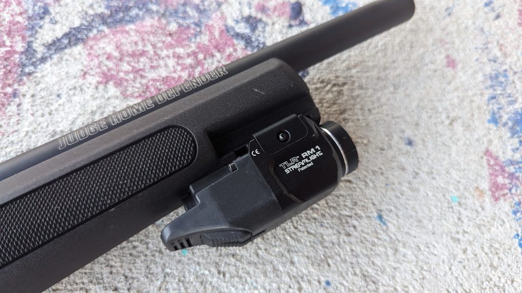 I’ve tried a few different lights but settled on the very compact TL RM1. This lightweight, compact light is designed for long guns but works very well for the Home Defender. The ergonomics of the ramp-style switch make it easy to access. I can also use a pressure switch if I so choose.