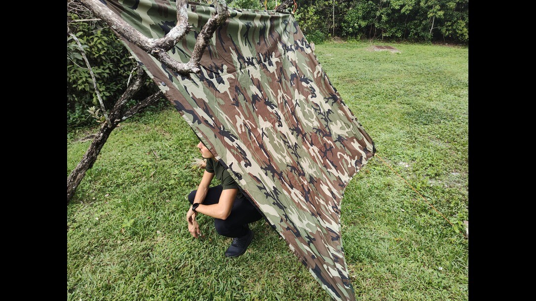 It was a simple task to secure cordage and string the blanket overhead. With a square footage just over twenty-six square feet, there was ample room underneath to protect me from both falling rain and intense overhead sunshine.