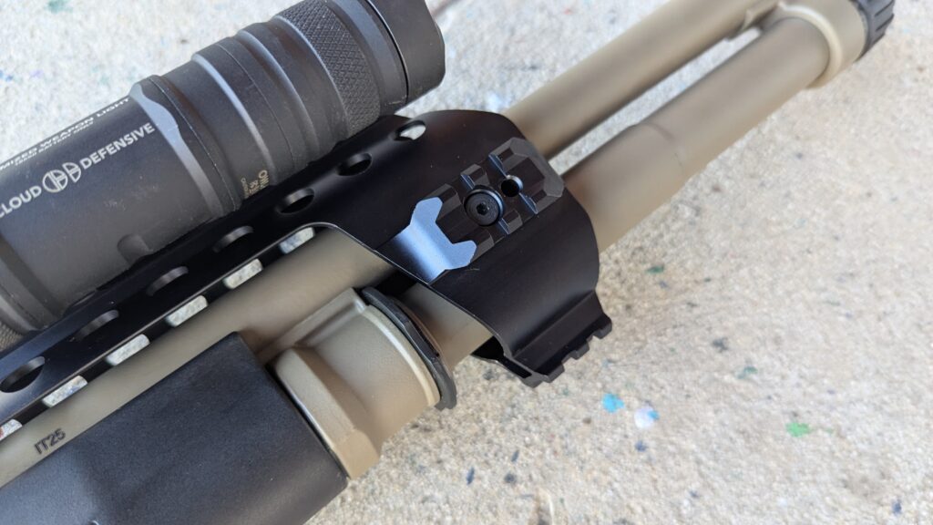 You position the clamps on the magazine tube and barrel in a specific position because two bolts from the quad rail have to attach to the clamps. To figure out where I had to mount those clamps and plates, I had to attach the rail to the optic’s rail riser with one screw, mark the tube, detach it from the optic’s rail adapter, and then place the clamps.