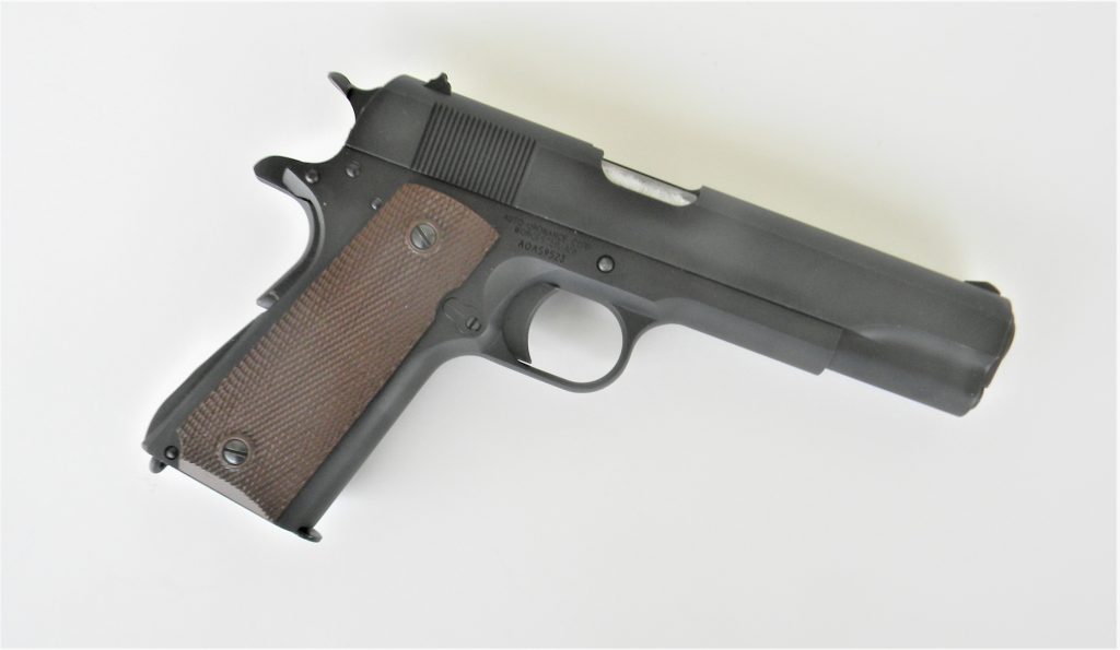 The ejection port – sometimes called slide window in period reports- is small. So was the original. Modern enlarged ejection ports made administrative handling much easier. There are differences between the Auto Ordnance and original as may be expected. The pistol is a little tighter with less lateral play between the slide and the frame than a wartime 1911. We like our pistols to be accurate more so than we need them to come up shooting after a drop in the mud these day. The second addition is a firing pin block. This prevents forward travel of the firing pin if the pistol is dropped, particularly if dropped on the muzzle. This doesn’t affect the trigger action as the Auto Ordnance pistol features a trigger that breaks at a clean 7.2 lbs. Forgings are stronger than steel and the primary action parts of the 1911A1 are steel. A 1911 must have 1/32 inch clearance between the two halves of the feed ramp for proper feeding. The Auto Ordnance neatly accomplishes this. The top of the chamber should also be smooth. This handgun accomplishes this as well. The barrel bushing is snug but only finger tight.