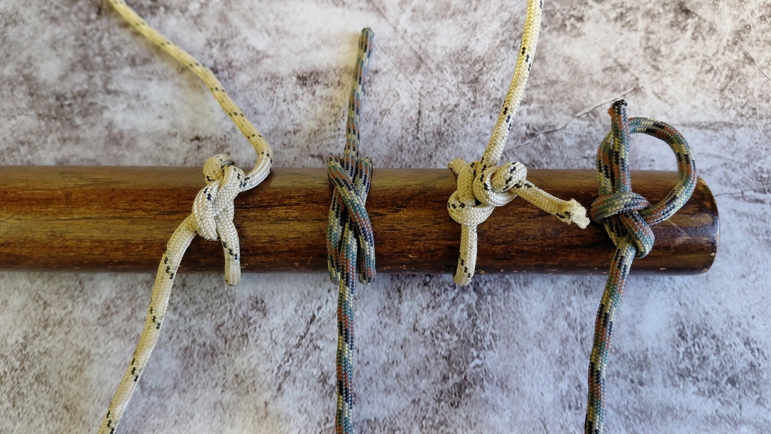 What It’s For: The clove hitch attaches a rope quickly to a post, tree, or pole. It grips well under steady tension and is easy to adjust, making it perfect for shelter ridgelines and fast lashings.