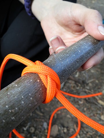 How To Tie It: First, wrap the rope all the way around your bundle or tree, like you’re giving it a belt. Take one end and make an overhand knot near the end, leaving about half an inch sticking out (tag end). Now make another overhand knot an inch or so down from the first knot. Leave it a little loose so the working end can slide through it up towards the first knot near the end.