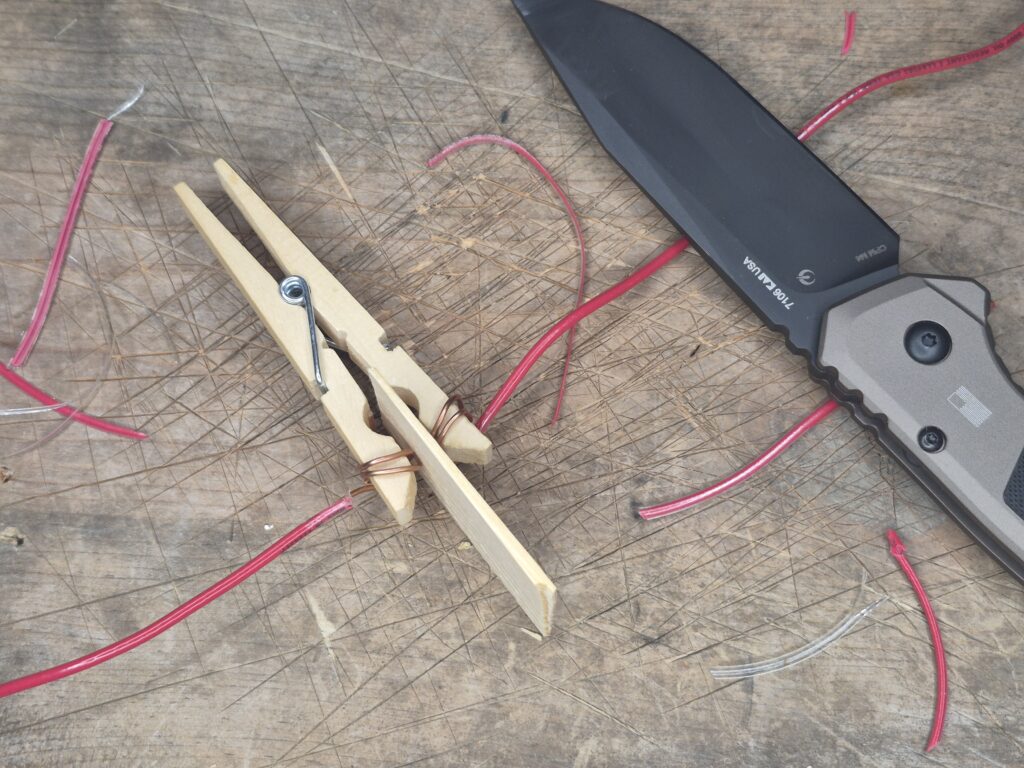 Secure the clothespin in such a way that it can’t move, such as tacked to a post or tree. Place a small scrap of wood between the jaws, preventing them from touching. Attach a trip line to the piece of wood. When someone trips the line, it will pull the wood from the clothespin, allowing the wires to touch and complete the circuit.