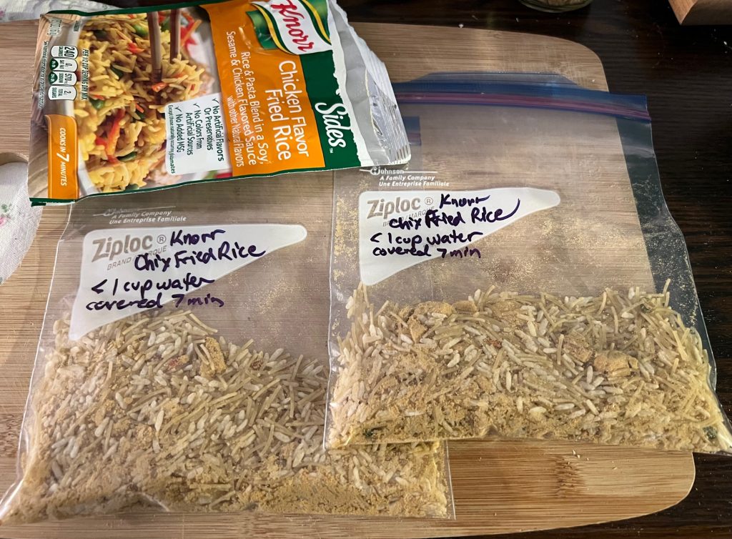 -Divide up pre-packaged rice mixes into serving size ziploc bags and adjust the water added accordingly. Write that volume on the bag so it’s there when you need to use it. This saves making more than you can eat and having to keep leftovers cool.