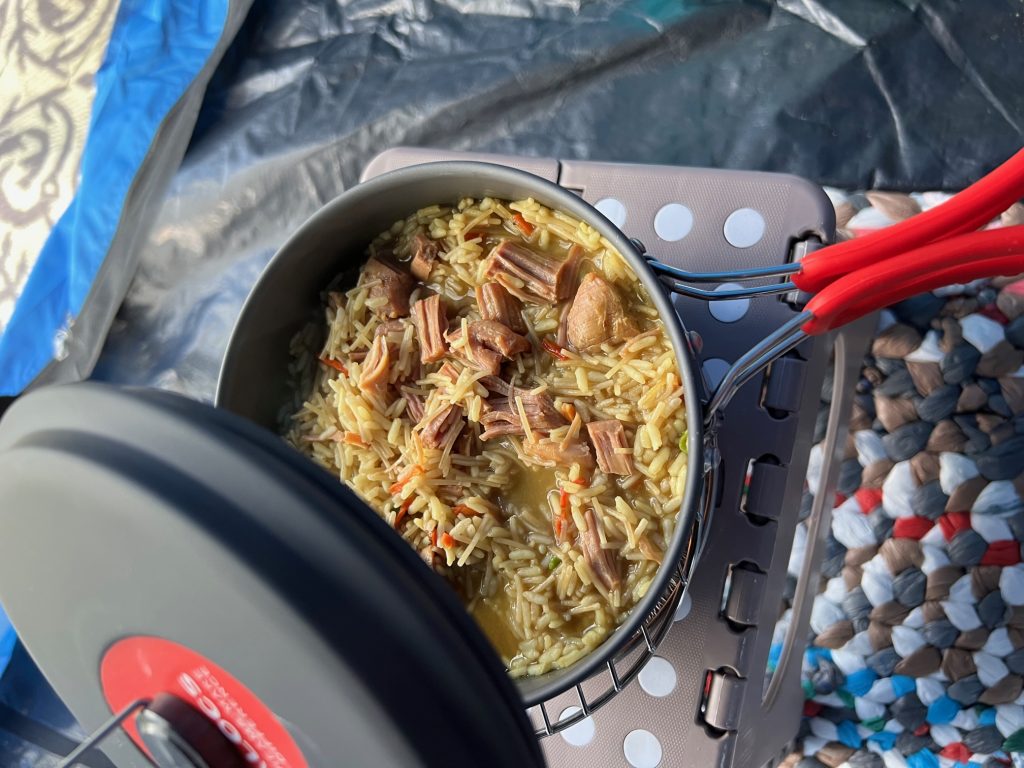 But back to the food. Because I go camping on a budget I try to eat from my existing shelf stash without investing in specialty food items. I also supplement with some commercial shelf stable items. I’m talking cheap small serving things like single serve Spam, chicken Vienna sausages, some Knorr packaged rice mixes, and even a couple Hormel microwave bowls. It’s good practice to test out your food plan for SHTF or bug-out/evacuation scenarios. I’ve tried out a few different kinds of meals at this point, and these are things that have worked for me so far in cooking for a single person.