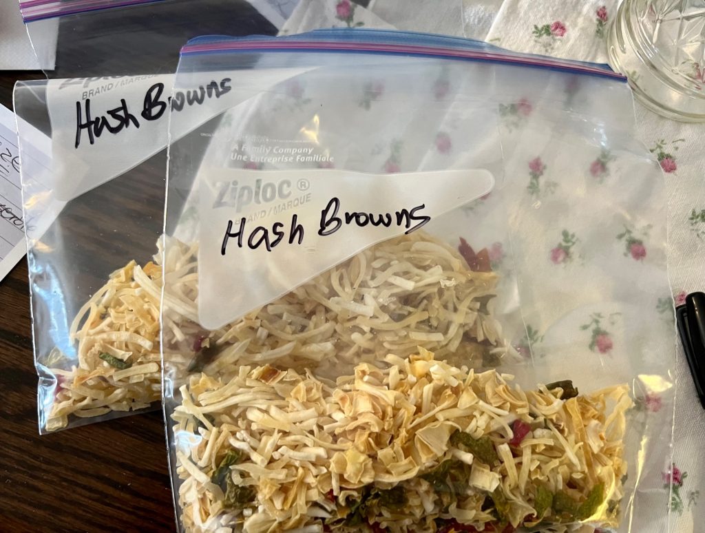 -Home dehydrated hash browns can also be pre-measured and mixed with other dried veggies ( like peppers and onions) for breakfast hash.