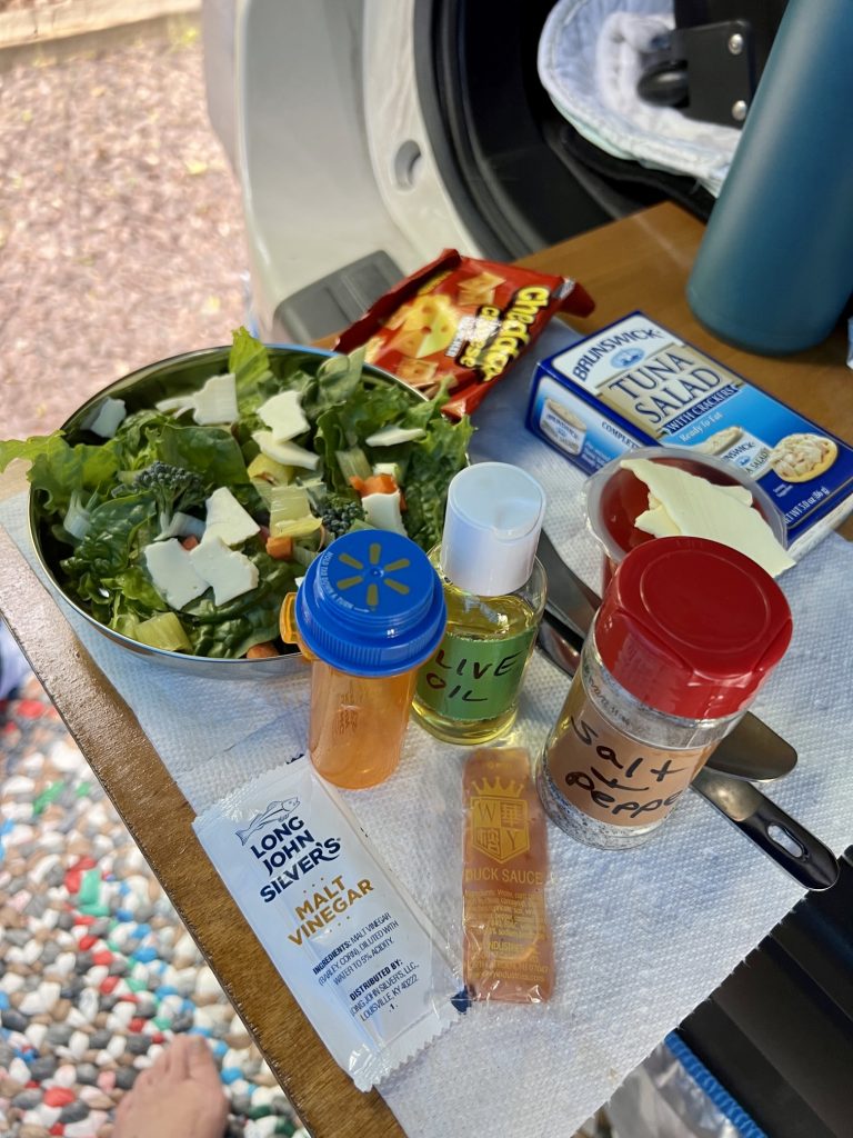 -Consider individual packets of soy sauce and condiments to save cooler space. I made “salad dressing” out of a packet of malt vinegar from a fast food joint, combined with a packet of duck sauce from another joint and a squirt of olive oil I had along for cooking, shook it up in a pill bottle and it was delicious!