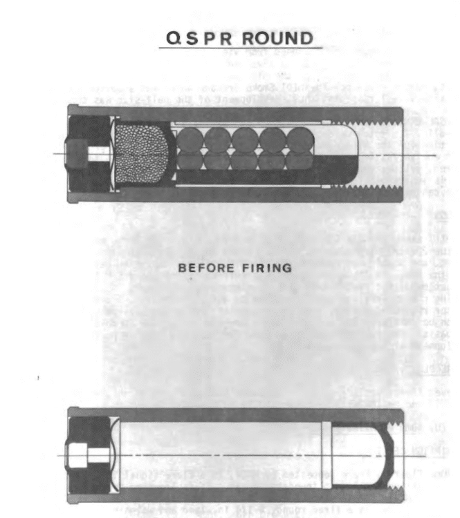 This weird cartridge design used a captive piston that was held inside the cartridge. When fired, burning gun powder propelled the piston, propelling a small load of ‘shot.’ These loads were reportedly much quieter than a standard firearm.