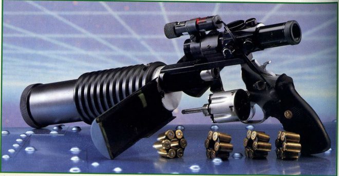 Other solutions involve encapsulating the entire cylinder with a large suppressor system. This was the solution dreamed up for Germany’s SEK teams. The designer, Joe Peters, built a crazy suppressor design for S&W Model 625 revolvers that looked like it walked out of Star Wars.