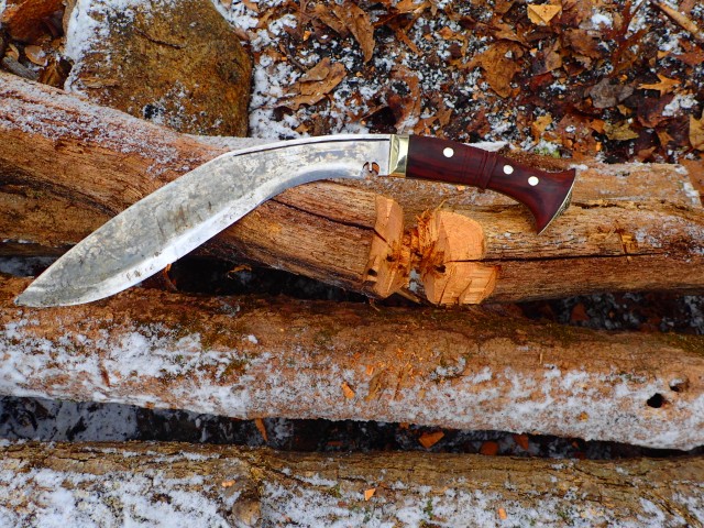 A true Nepali‑forged kukri carries soul. The Survival Kukri from Knives by Hand follows traditional forging lines—thick spine, curved belly, and a chopping sweet spot that hits like a compact axe. The forward curve drives the edge into wood with surprising efficiency. In cold weather, that geometry shines because the blade wants to bite without extra force.