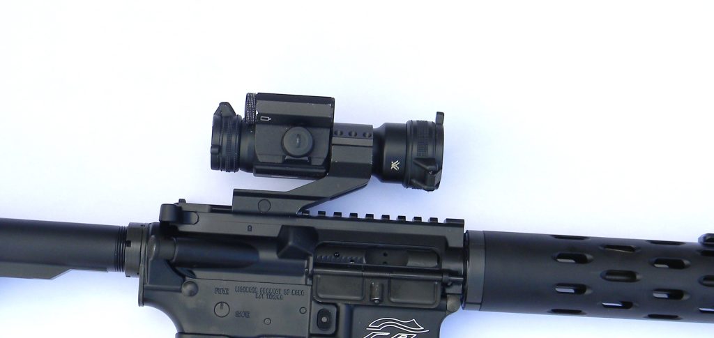 When the Colt Competetion Ready is examined a first impression tells you that the rifle is very nicely fitted. The receivers are tight, very tight, and care had gone into fitting the rifle. The forend is well chosen offering superior gipping ability. The muzzle break seemed effective. While the .223 doesn’t offer much recoil when you are firing rapid fire and running a combat course recovery is more rapid with a good break. I purchased the rifle without optics. I added a Vortex Strikefire II red dot sight. Here is what Vortex has to say about their RDS-