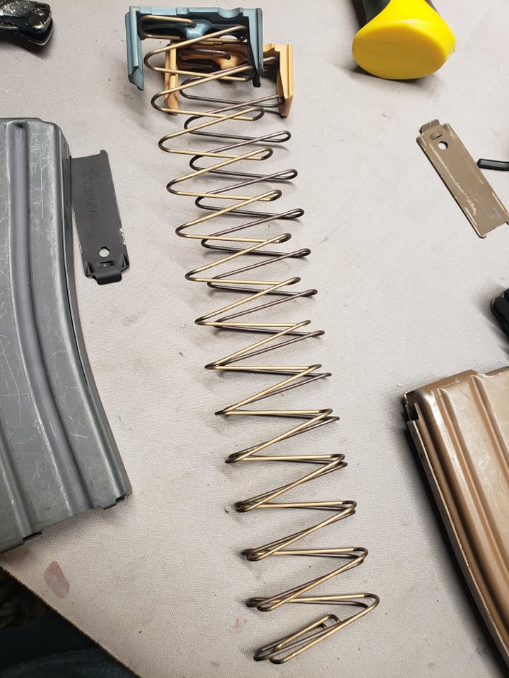 GI magazines are not reliable inside M249s and have shown that they simply don’t have enough spring power, so to say, to keep up with the higher rate of cycling compared to an AR-15. You can configure the magazines to function a bit better by taking another spring from another GI magazine and stacking them together. Stacking meaning doubling together side by side, not stacking on top of each other. This can give the spring more strength.
