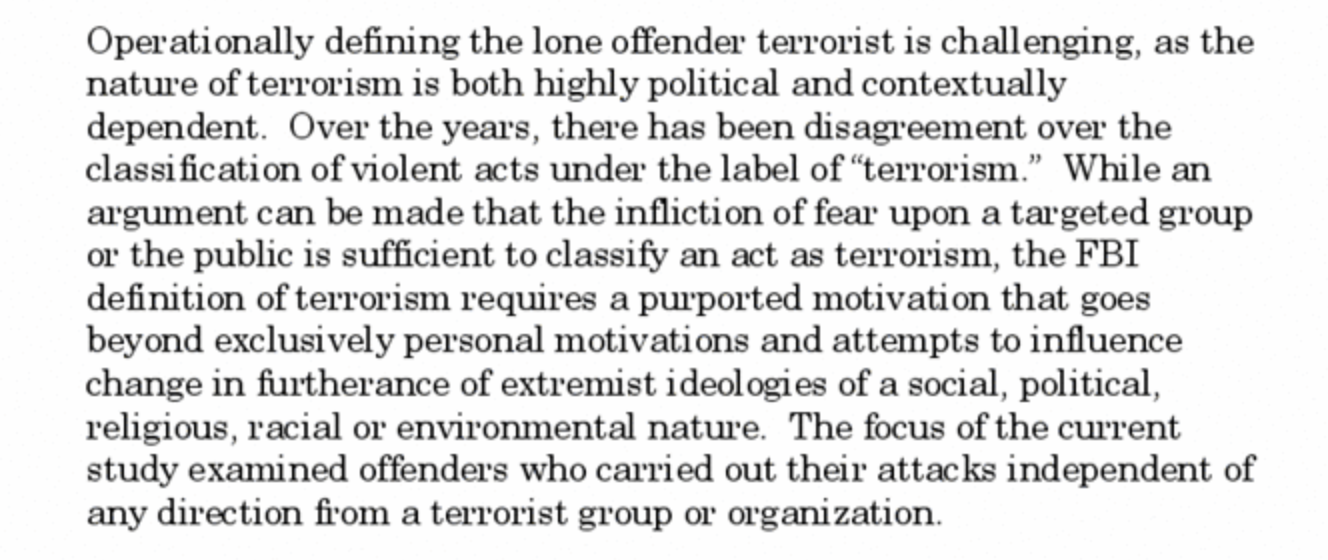 240 possible cases were initially reviewed for this study and it was found that only 52 met the criteria. The time frame is from 1972 to 2015. The individual incidents themselves may not be the only incident a given LWT was involved with, but they perpetrated an event at some point that met all the criteria. The report does not name perpetrators in order to give focus to the data over the individual incidents. But for anyone curious enough and within the time parameters the incidents and their actors are readily identifiable.