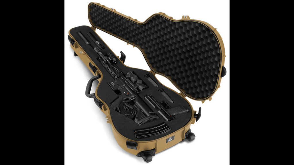 When it comes to unique rifle cases, this incredible guitar case version by Saviour Equipment takes the top spot. Designed to perfectly mimic a hardshell guitar case, you’ll carry your weapon around town with discretion and security. The case’s vast amenities include a durable outer shell, polyurethane easter foam sheets, top and side handles, and durable wheels that allow easy transport. Choose from black, grey, or tan colors. Enjoy your trip to the range with all eyes off you.