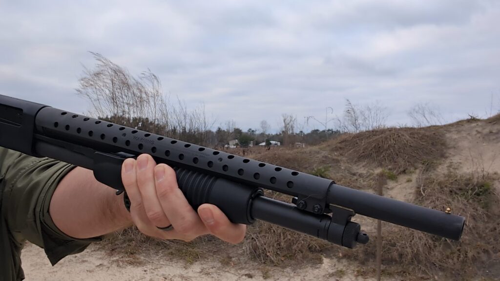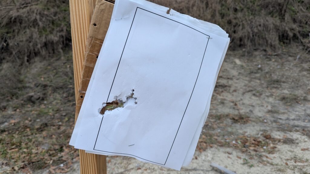 At ten yards, it is under three inches, which means it is plenty tight for defensive use. At 15 yards, the pattern opened up enough to see individual pellet holes and measured about five inches wide and five inches vertically.