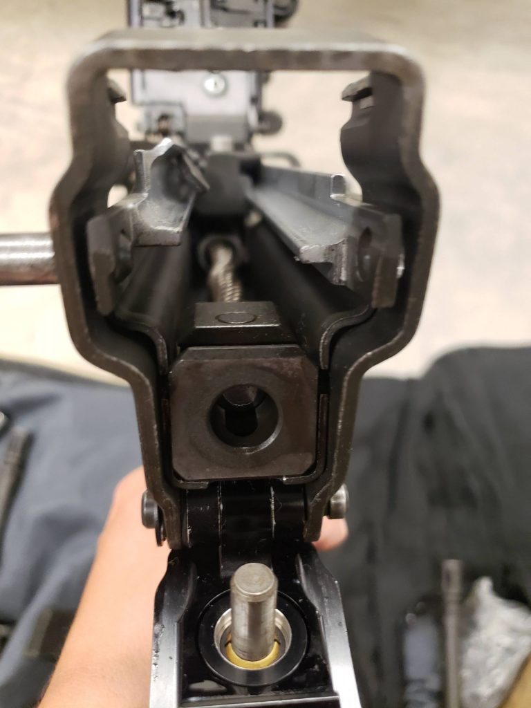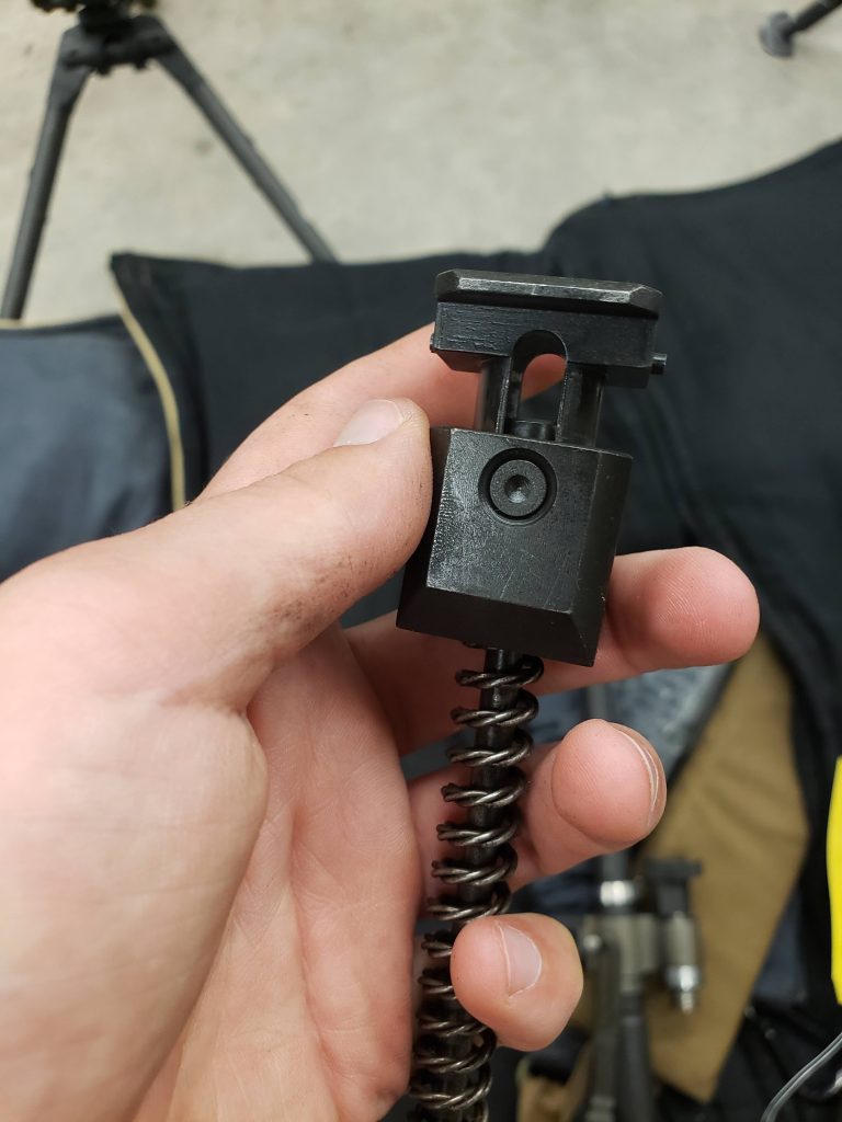 On the drive rod assembly there is a riveted or (dimpled) pin that holds the assembly together. Owners and operators of this gun often install the rod with the dimple up and exposed. I have also seen them somehow lock the two pins on each side inside the receiver at the 12 and 6 o’clock.