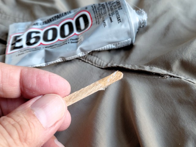 Yes, the mystery goo was fabric glue, and I use it to fix pockets with holes and patch jobs. Mostly, my back pockets lose their stitching, but now I can easily solve that. Fabric glue is rubbery with a consistency of gum. A small, wooden coffee stirrer or popsicle stick is a good applicator. It’s flexible and waterproof. Like magic in a tube!