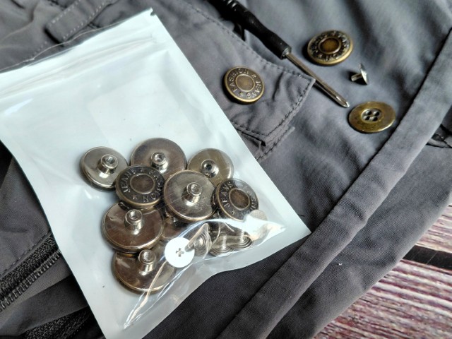 I found these 17mm brass no-sew buttons, and they install easily with a screwdriver—no tools or sewing needed. The kit includes a tool and threaded rivets that screw in securely yet remove cleanly for reuse or adjustment. This kit makes it easy to add space when pants feel tight or tighten loose waistbands, too.