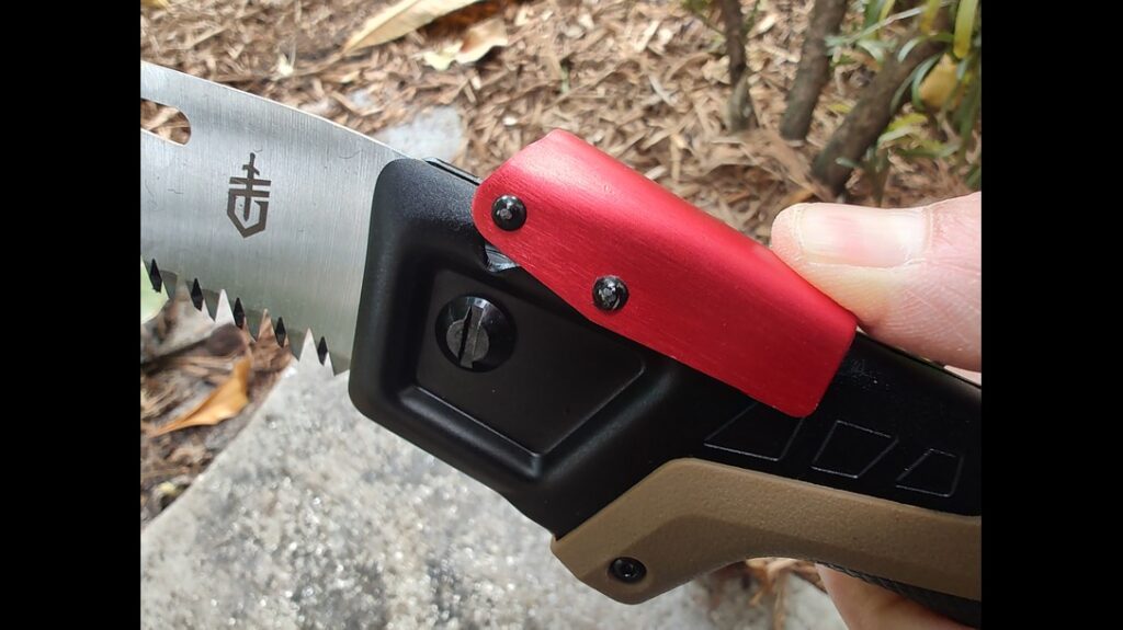 Second, the giant red lever-type gadget at the top of the saw couldn’t be missed. A simple press of this spring-loaded lever allowed the blade to be released and opened. Its operation was smooth, and once the button was released, the blade stayed firmly in place (whether closed or opened).