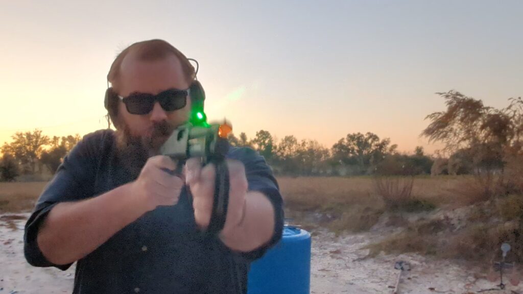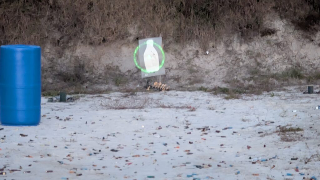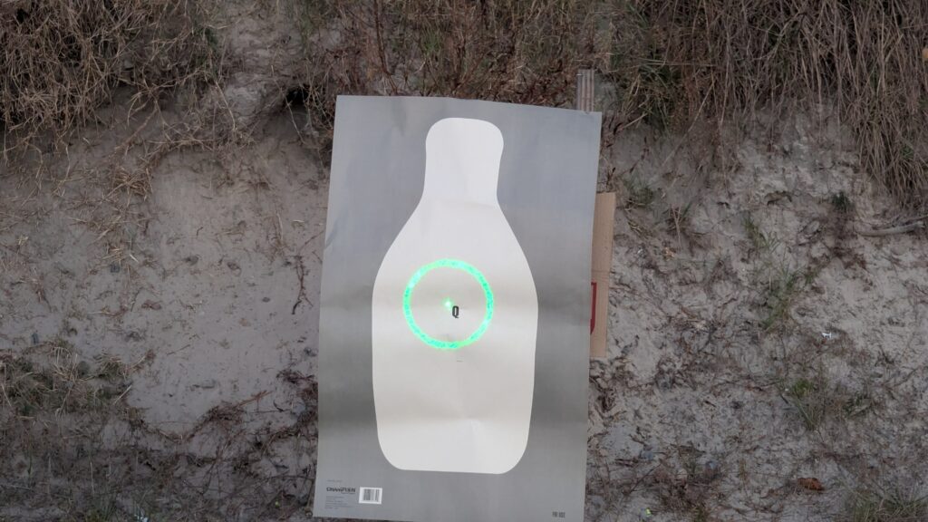 Installing it on an optics rail creates a weird ergonomic situation. Turning it on and off requires a lot of hand movement and can’t be done from a firing position. The giant circle and dot grow and shrink as your distance to the target grows and shrinks. It’s admittedly huge and quite bright.