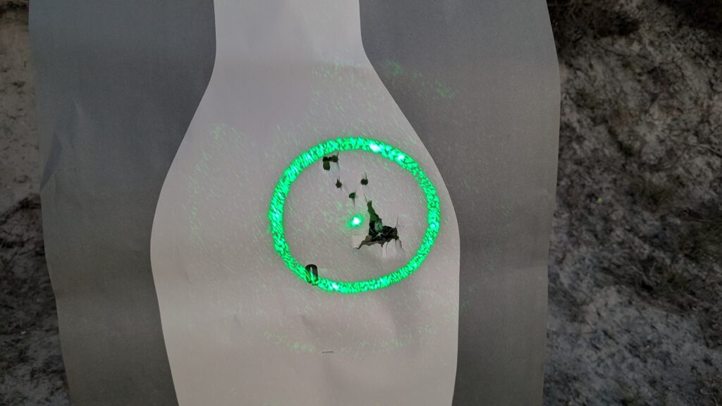 Theoretically, if you found the right combo of gun and ammo, you could use the circle to pattern your gun. I figured I could probably find something close, at least somewhat close. I did a quick zero, reminded myself that up and down would be reversed in this layout. It didn’t take long before the buckshot landed where the laser hit.