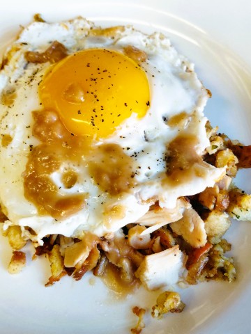 This dish is more of a must-taste than a best-in-show dish. In fact, it doesn’t look too appetizing. However, the smell of it cooking and the taste are outstanding. You’ll need an egg, gravy, stuffing, and the rockstar—turkey.