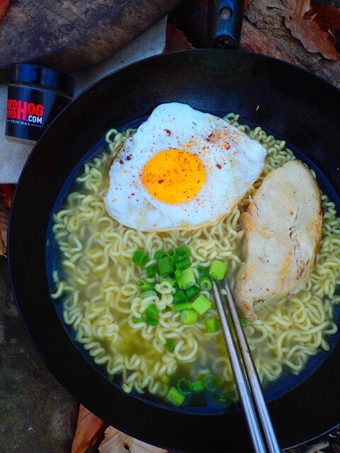 In camp, fry an egg and set it aside. If at home, fry the egg in a separate pan towards the end. In camp, it’s a one-pot meal. Make the ramen as usual. It’s better to make it more soupy than dry. The special ingredient is about a tablespoon of saved turkey juices. Mix it into the broth for max holiday essence.