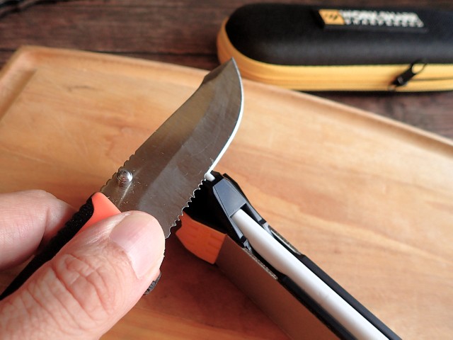 Work Sharp gives you a carrying case, similar in size and appearance to a pencil and sunglasses case. It’s sturdy with a substantial loop to carry in your hand or clipped to a pack via a carabiner. The elastic band (similar to a seatbelt) holds the sharpening unit in place. Work Sharp added an elastic mesh on top to keep the diamond plates securely in place.
