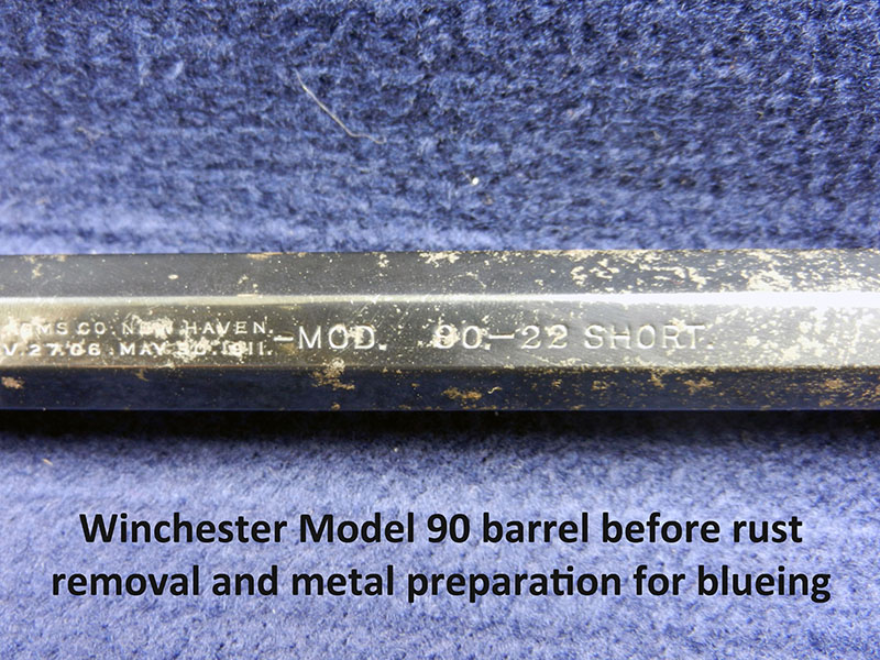I told the customer I would disassemble the gun completely, strip the incorrect blueing and carefully re-polish the metal, straightening the edges, flattening the screw and pin holes, and re-marking the nomenclature on the barrel and tang with the correct text used by the factory. Then, I would begin the tedious process of re-bluing the metal, using Winchester’s original process. The lever and hammer would be refinished using a process called color case hardening; the screws, pins and extractor would be nitre blued and the fore end tip and butt plate would be charcoal blued. The stock and fore end wood would be refinished, again, using the original Winchester methods. This is a costly process, at least $2000.00; however, it could increase the gun’s value to about $12,000.00. A worthwhile return on investment.