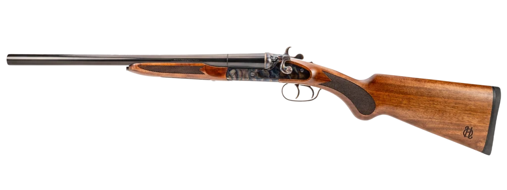 The Heritage Coachwhip is a side-by-side coach gun that exudes 19th-century style. It has a 3″ chamber, so it will fire both 2-3/4 and 3-inch shells. The barrels are 18.5 inches long and have a brass bead front sight and cylinder bore. The barrels are finished with black chrome, that mimics the deep rust blueing of old. The frame has a case-hardened finish. The buttstock and foreend are of rich Turkish walnut. The Coachwhip has fine checkering on the pistol grip and foreend.