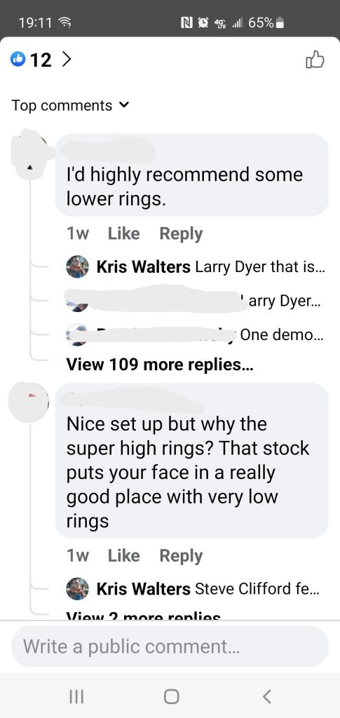 When keeping my traditional cheek weld position on the stock, this caused my eye to get farther from the scope and made it higher in relation to the scope position, which in turn was making my shots go lower…my eye was not looking through the same place in the scope every time! Even though I was well within my comfortable and clear eye relief (eye box) the small shift in eye placement was changing my POI (point of impact). In essence was inducing a small parallax error! I kept running this test over the next several months changing LOP (length of pull), facial anchor point (cheek weld), comb height and scope ring heights.