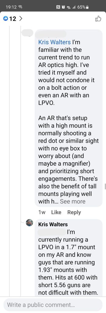 Kris Walters, currently a platoon sergeant for a BN scout/sniper platoon, made a post in a Jeff Cooper Scout Rifle group showing his latest scout rifle build. This brought out a myriad of comments about scope ring height, low cheek weld, head position, bore offset etc. Many of the comments stated that having a higher scope height will hurt you as a shooter rather than help, especially in the applications today.