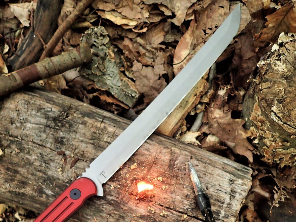 The Kwaichete echoes the Japanese wakizashi, a compact sword carried for close work. Hoback’s version stretches 19 inches overall, with a 12-inch blade forged from 154CM stainless steel. A seven-inch handle wrapped in Ruby Red SureTouch scales balances the package, slim at one inch wide and an eighth-inch thick. At just under 15 ounces, it moves fast in the hand. A black Kydex sheath locks the sword into place for quick carry.