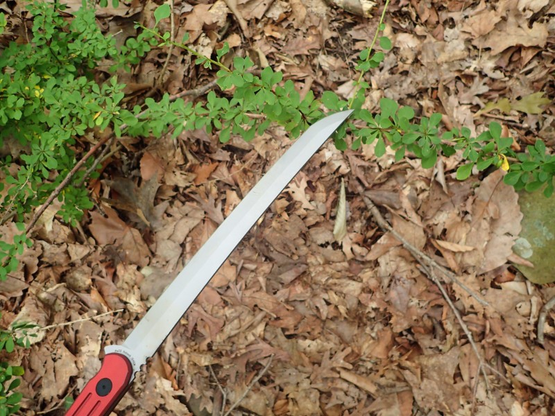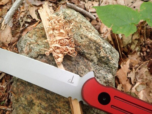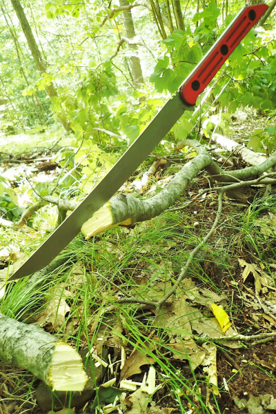 The Kwaichete isn’t just a showpiece—it’s a camp workhorse. I used it to clear thorny barberry vines that clawed at ankles and knees. Later, a fallen maple bough became raw material for traps and tools. Finger-thick branches snapped with one swing, while wrist-thick sections gave way after a few chops. Even in the summer heat, the blade stayed swift and sharp.