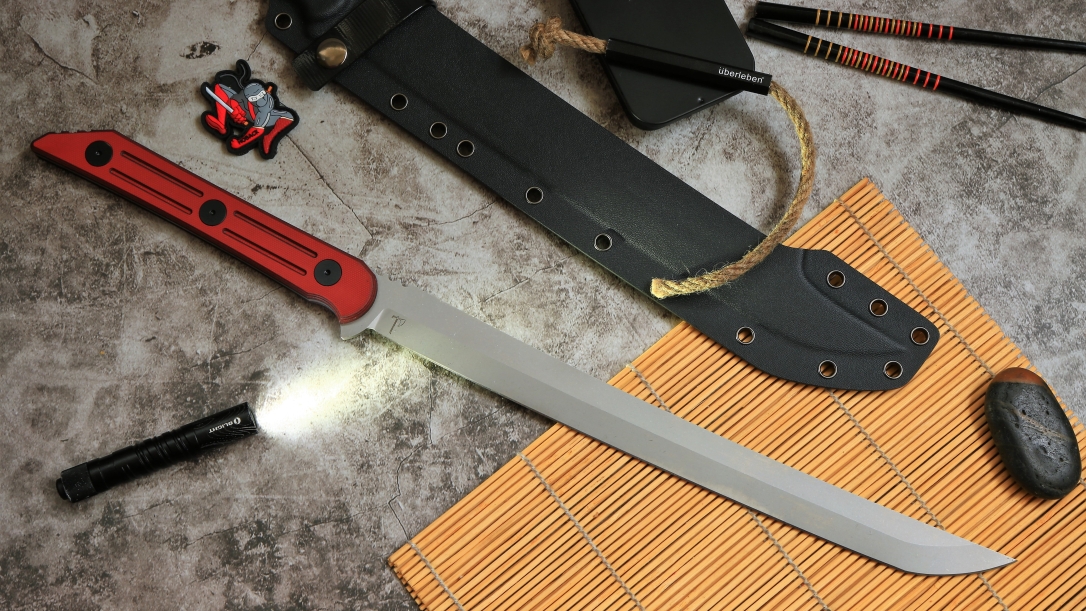The Kwaichete echoes the Japanese wakizashi, a compact sword carried for close work. Hoback’s version stretches 19 inches overall, with a 12-inch blade forged from 154CM stainless steel. A seven-inch handle wrapped in Ruby Red SureTouch scales balances the package, slim at one inch wide and an eighth-inch thick. At just under 15 ounces, it moves fast in the hand. A black Kydex sheath locks the sword into place for quick carry.