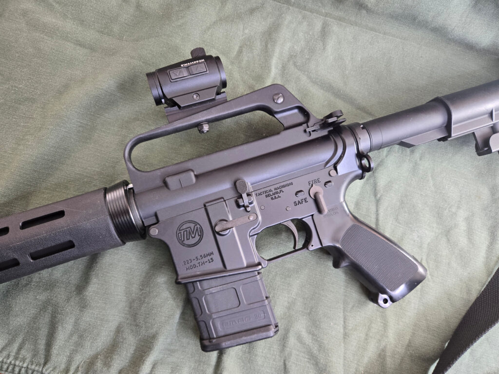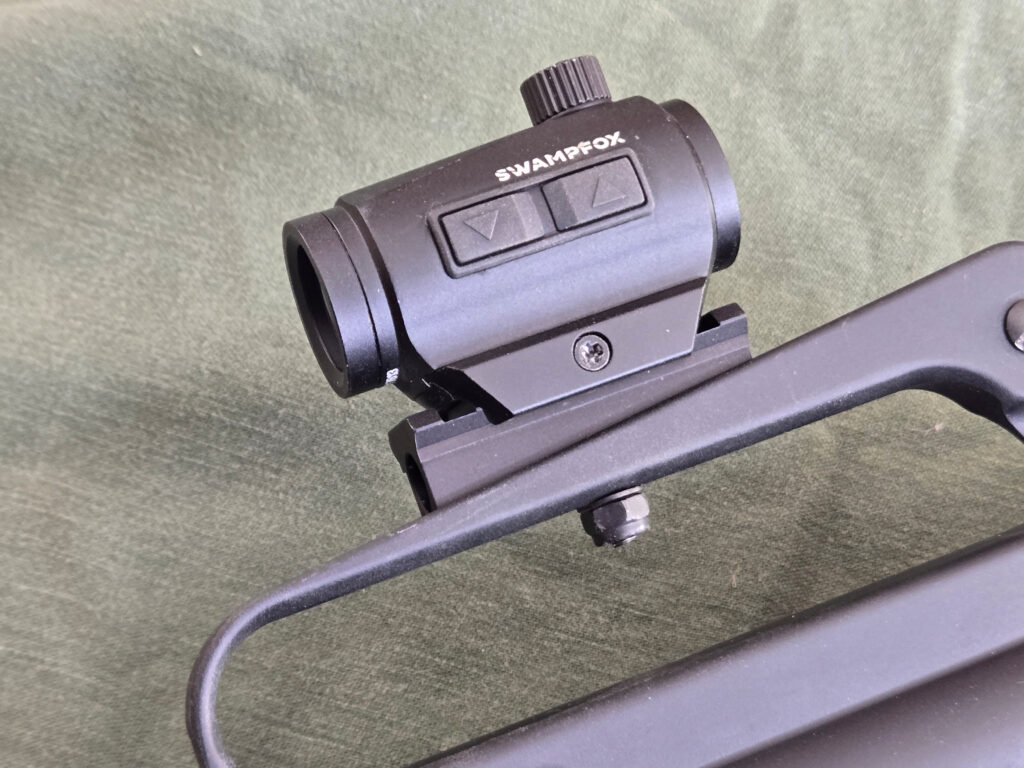 For an optic, I used a Swampfox Liberator II. I have a few of these optics on different builds. They’re solid and affordable. The Liberator II is 2.55 by 1.68 by 1.62 inches, and weighs only 3.49 ounces. MSRP is just $159.00. I’ve been running these sights for about five years now with no issues.