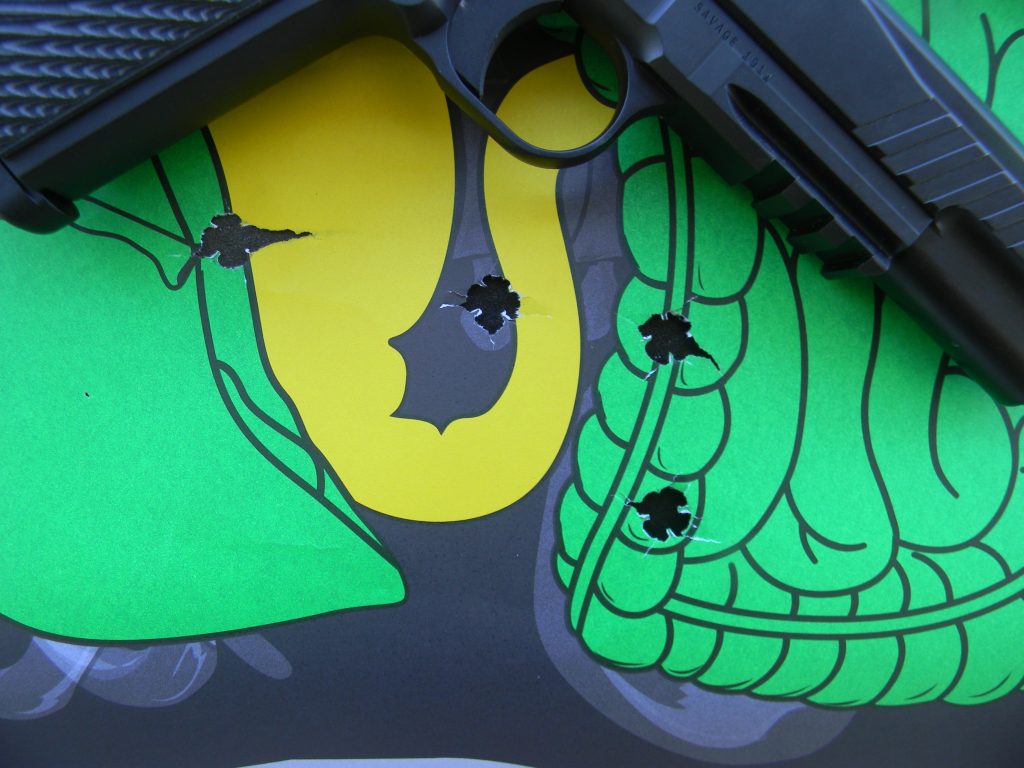 I also fired the 135 grain .45 ACP Lehigh. A fluted bullet designed to chop tissue and create damage by fluid force is more difficult to qualify than an expanding bullet. Expansion is obvious, fluid damage is not. These bullets penetrate less than a full metal jacketed bullet and cause a lot of damage in water jugs and gelatin. Advertised at 1250 fps this load clocked at 1190 fps. The Savage 1911 pistol exhibited good accuracy, firing both off hand and from a braced firing position. Powder burn is clean with limited muzzle blast.