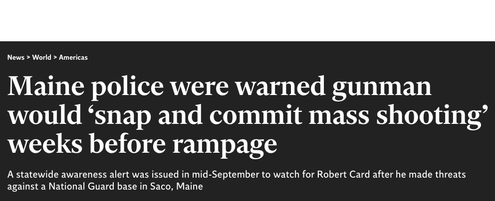I’ve seen it written a few places that Maine doesn’t have a “Red Flag Law” and that this is what failed to prevent the tragedy. They have a colloquially titled “Yellow Flag Law” which seems to function exactly the same.