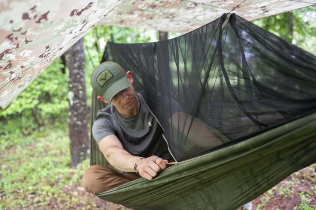 Materials are battle-built. The hammock uses high‑strength, breathable ripstop with permethrin infusion, paired with aluminum tri‑fin stakes and waterproof, flame‑retardant tarp fabric. The tarp’s catenary cut corners pitch tight in high winds, and its six‑point tensioning system makes adjustments quick. Even the camouflage pattern is directional, designed to blend seamlessly when strung horizontally to the ground.