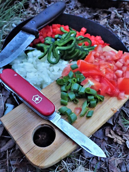 Patrick Rollins brought ground deer from a recent hunt, and this trip gave us the perfect excuse to use it. Cutting vegetables before touching raw meat keeps things cleaner when running water doesn’t exist. Knives get wiped, sanitized, or dipped in boiling water. That’s the reality of a backwoods kitchen.