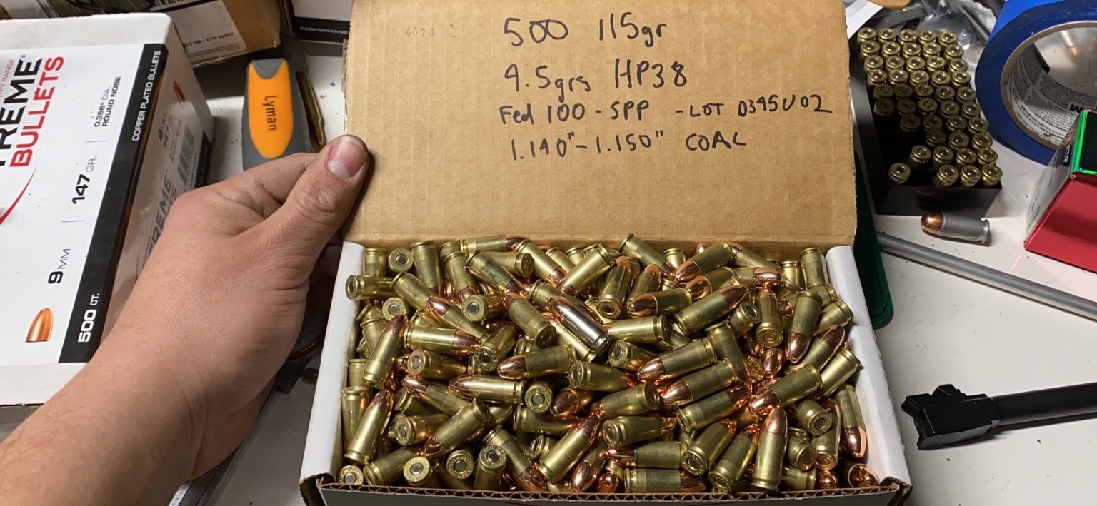 For a number of years now, I’ve had a pet 9mm go-to load that I use for general purposes and works across my 9mm handguns. This load is as follows: A 115 grain coated lead or plated bullet sitting on top of 4.5 grains of Hodgdon HP-38 (or Winchester W231 powder because they’re literally the same thing). My Dillon machine is set up to seat the bullet at 1.150” cartridge overall length, which is something that I started to emulate from Speer Lawman factory ammo. I don’t have a preference between the coated lead and plated bullet, so I just typically use whatever is cheapest and/or available. I will use whatever brass I can pick up and process that is still suitable to be reloaded. I will typically use whatever small pistols primers I have on hand.