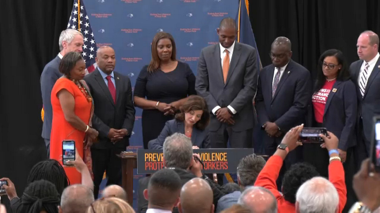 “It just keeps happening. Shots ring out, flags come down and nothing ever changes — except here in New York,” Hochul said.