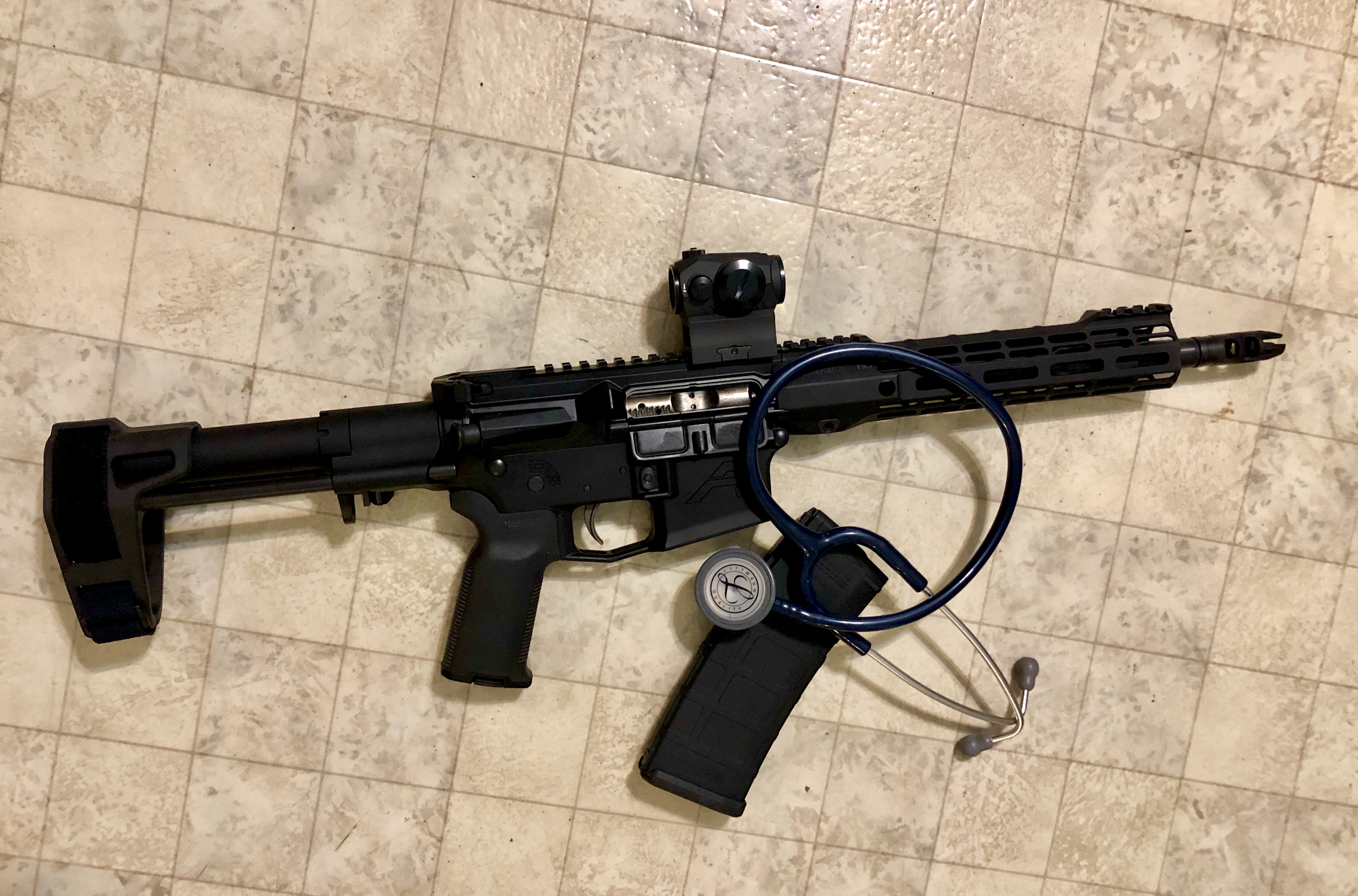 “IF” I kept a SHTF firearm at the office, it would have to be locked up. That is non-negotiable. I’m frequently away from my desk seeing patients, and there are tiny humans with curious fingers wandering all over the place. I also cannot realistically carry on-body during work hours as little children have no boundaries and are always patting on me and invading personal space. I would be “made” in short order. I’m thinking an AR pistol might be a viable option because of the smaller size, magazine capacity, maneuverability, velocity, and red dot.