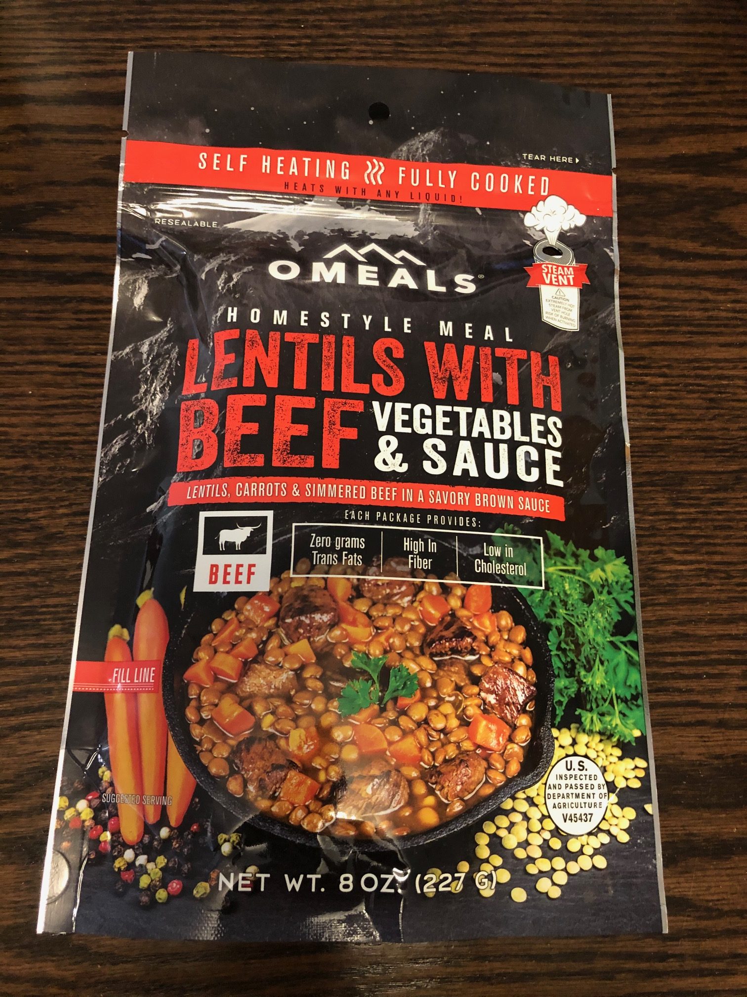 The spoon and napkin package came with salt and pepper packets, but I didn’t feel that my entree needed extra seasoning. I thought it was fairly tasty for a pre-packaged shelf stable meal. It didn’t look much like the package photo, but what prepared food does? There was a fair amount of meat, and the beans and lentils made it filling. Lentils are also pretty high in dietary fiber, so one should not experience the usual problem common with MRE’s (Meals Refusing to Exit) – at least with this particular entree.
