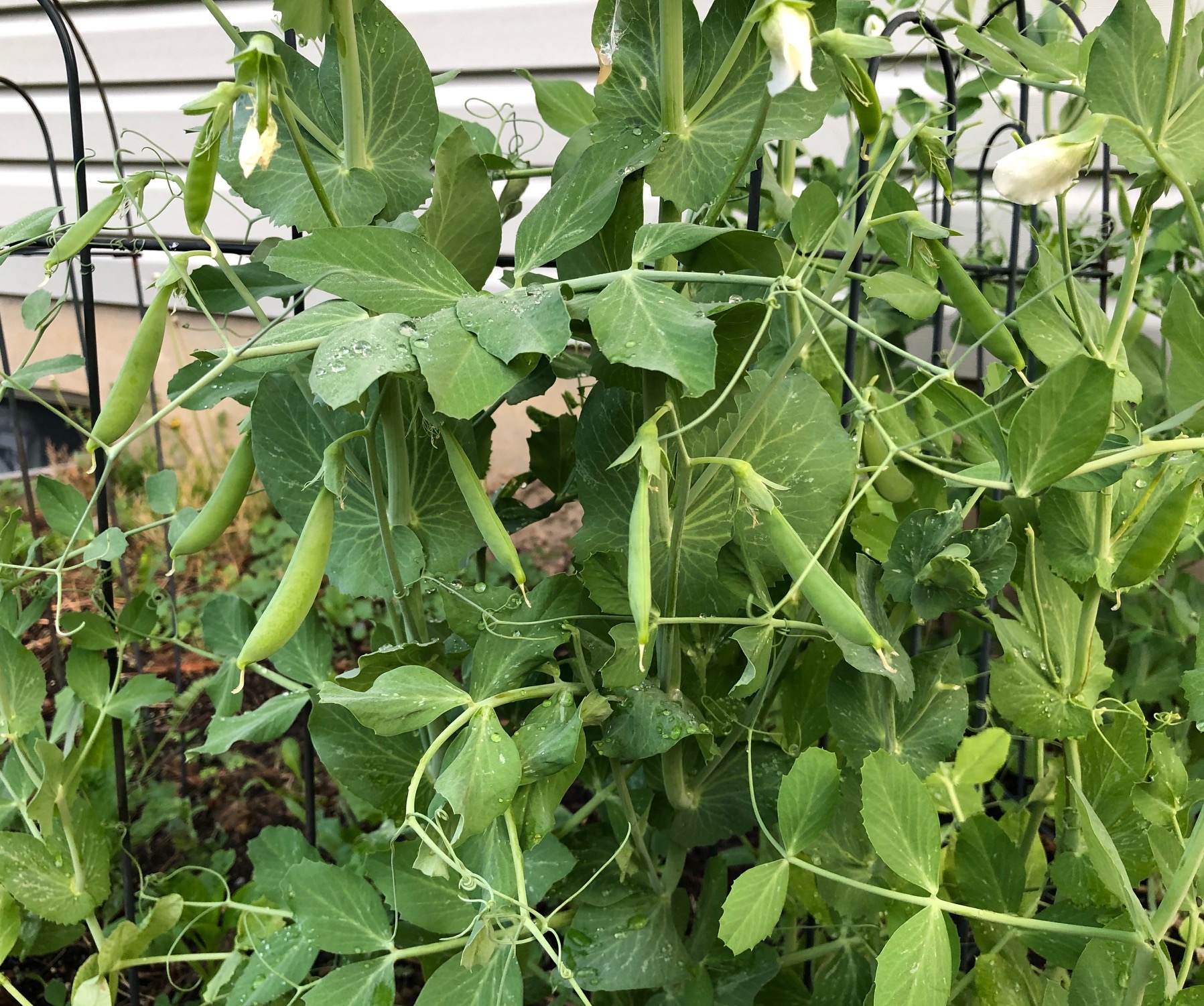 Peas are frost tolerant and it’s a good thing, because we had several frosts and even a couple skiffs of snow before the weather final broke in the middle of May. (We had snow on May 8th and frost on Mother’s Day). I think the position next to the south-facing house wall helped with shelter and temperature modulation in that regard. “Microclimates” is another thing I’m learning about.