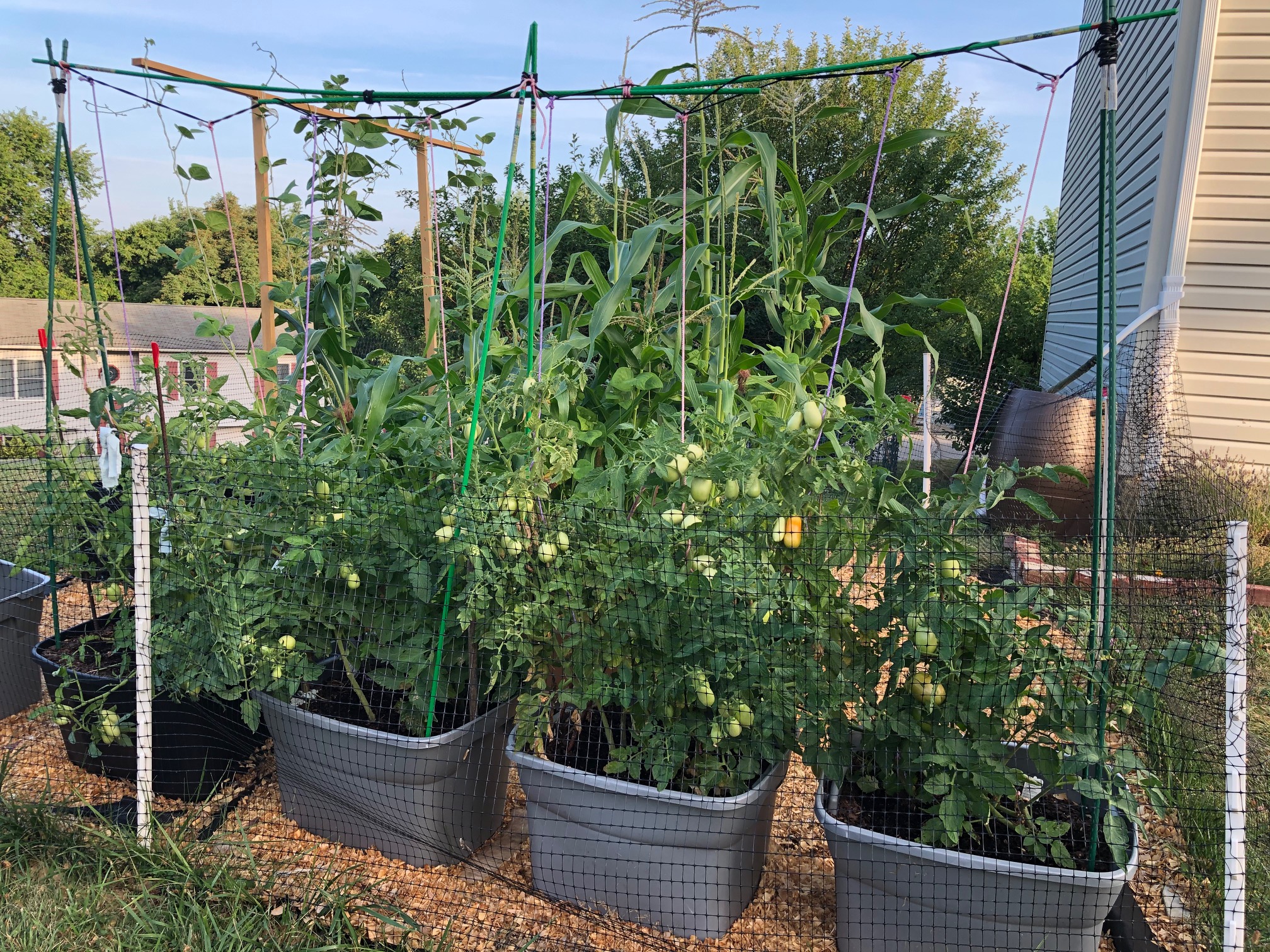 I was on the verge of trying to stake the 3-foot tall plants up in the window somehow when the weather finally broke. I planted my tomato starts outside in plastic storage tubs on May 16th, but they looked pretty pitiful and were not at all happy with the hardening off and transplant process.