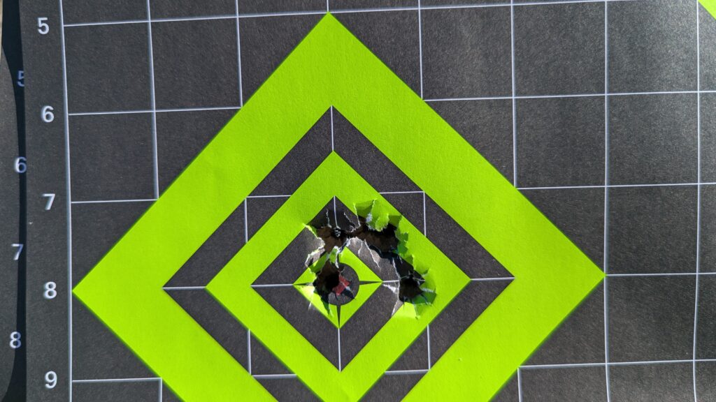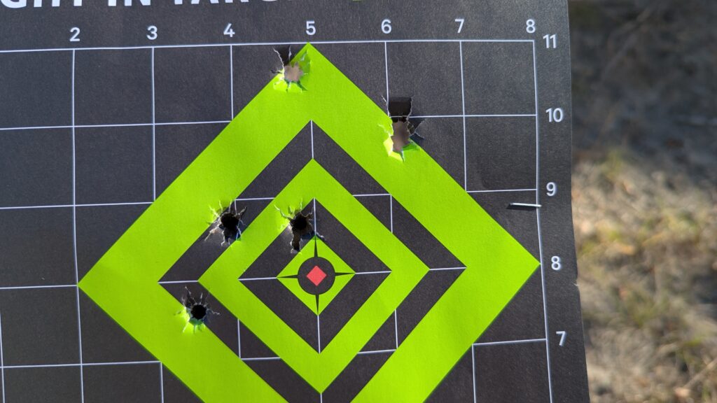 - 15 Yards: This is where the cracks started to show. The cheaper ammo became less consistent. I would put three rounds nearly dead center, only to have one round fly wide right and another land low. The premium ammo stayed tightly clustered.