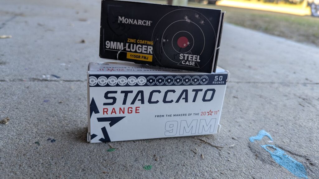 I started questioning my skills and my zero. To find out if the ammo was the culprit, I pitted several boxes of Staccato 124-grain range ammo against my standard Monarch FMJs.