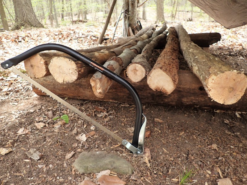 For a pole bed that could withstand cold nights, I cut logs to calf- to thigh-thickness, saving the stoutest pieces for the base. Six long, heavy poles formed the bed platform. The amount of work I knocked out with the bucksaw surprised me. A frame saw gives reach and stability, which means less effort and more progress. Chopping would have taken forever, and the job wasn’t even close to done.