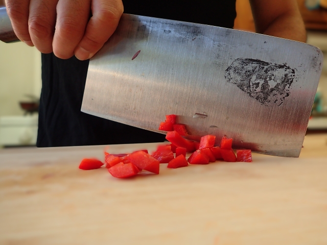 In contrast to rock-chopping with a Western chef’s knife, a flat-bladed knife does it differently. With a Chinese chef’s knife or a Japanese Santoku, we use the push-cutting technique. A simple, angled forward motion over the ingredients with the forearm is the easiest way to describe this method.